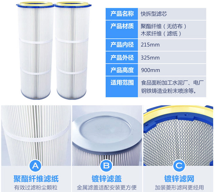 可用水洗。此濾筒適用既有纖維性粉塵又有非纖維性粉塵的應用、易聚結性粉塵的應用、以及在使用中需要對濾筒進行水洗之應用。例如:木材加工、谷物處理、復合材料的打磨、金屬拋光以及食品加工和制藥等應用。